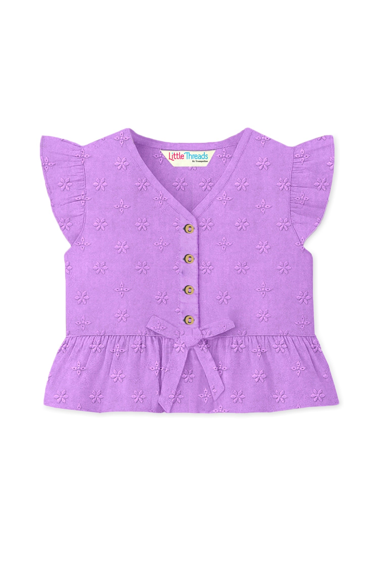 This adorable girls clothing set features a 100% cotton Schiffli embroidered top paired with matching trouser. Designed with a trendy V-neckline and flutter sleeves, it offers comfort with a modern twist. Perfect for casual outings, festive occasions, and everyday wear, this breathable and stylish set keeps your little one looking elegant all day.