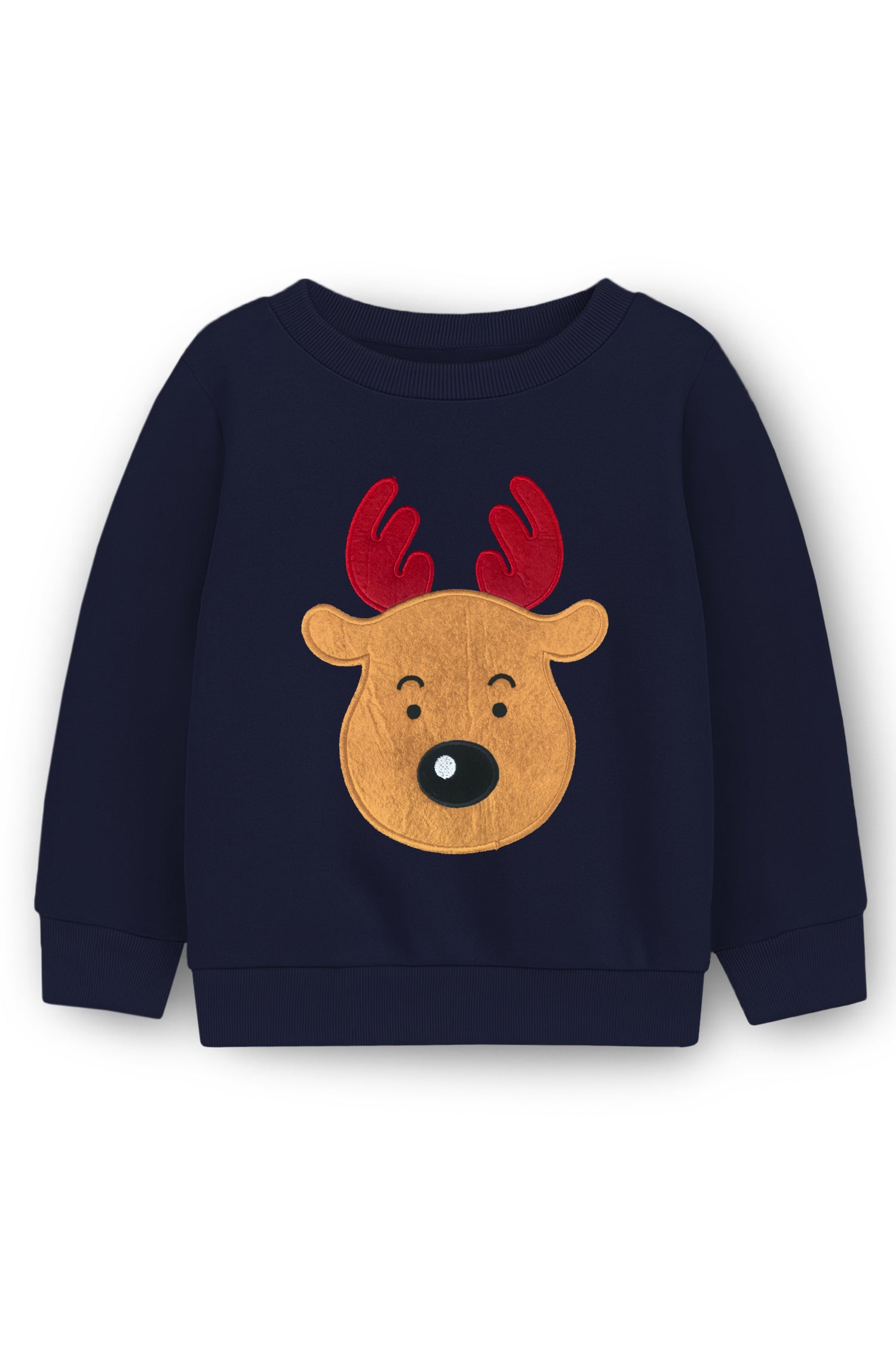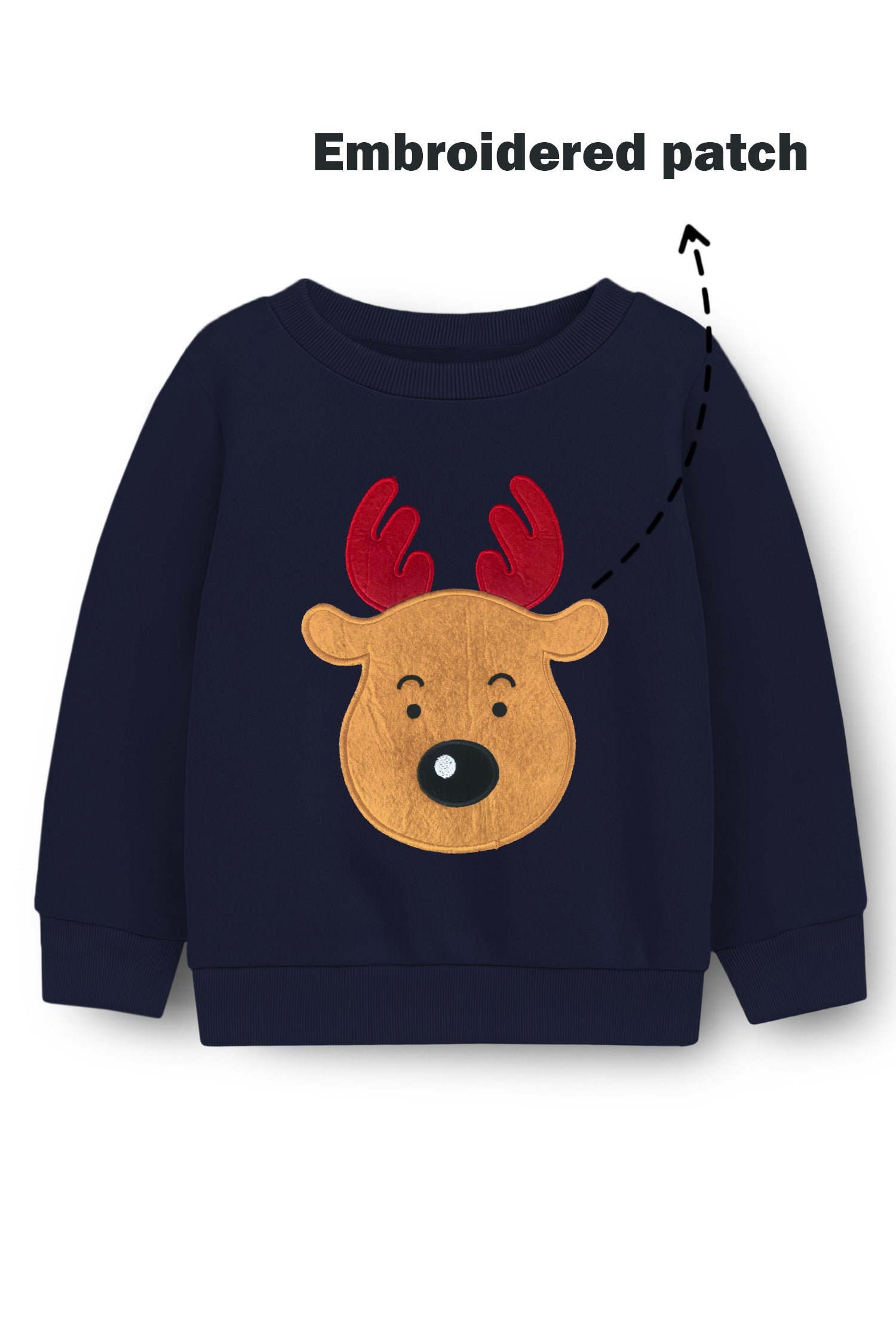 Trampoline Fleece Knit Christmas Theme Sweatshirt With Cute Embroidered Reindeer Patch - Navy Blue
