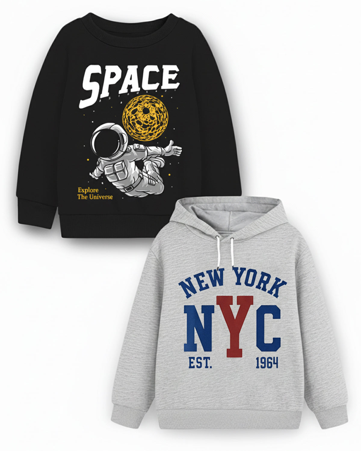 Trampoline Fleece Knit Full Sleeves Space & Nyc Printed Winter Sweatshirt Pack Of 2 - Black Grey