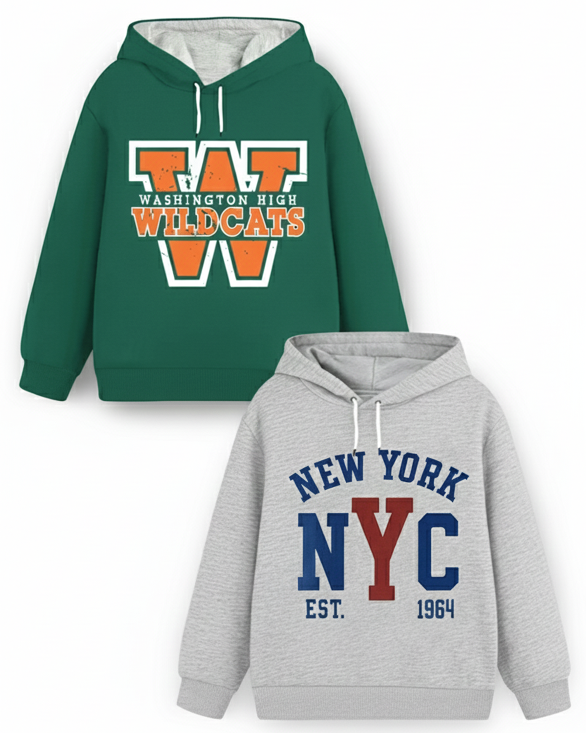Trampoline Fleece Knit Full Sleeves Wildcats & NYC Printed Winter Sweatshirt Pack of 2 - Green Grey
