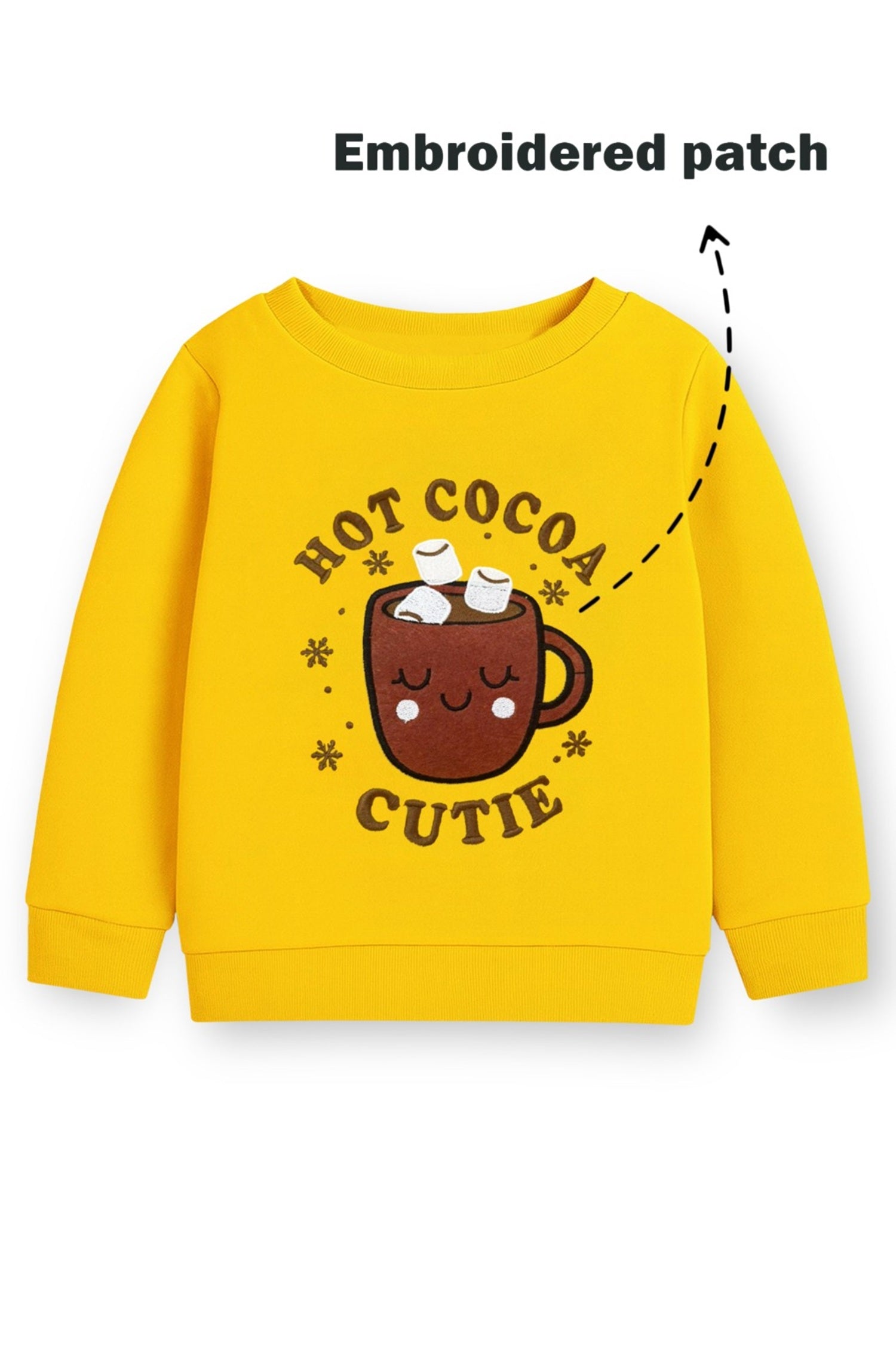 Trampoline Fleece Knit Full Sleeves Winter Sweatshirt with Cute Embroidered Hot Cocoa Cutie Patch - Yellow