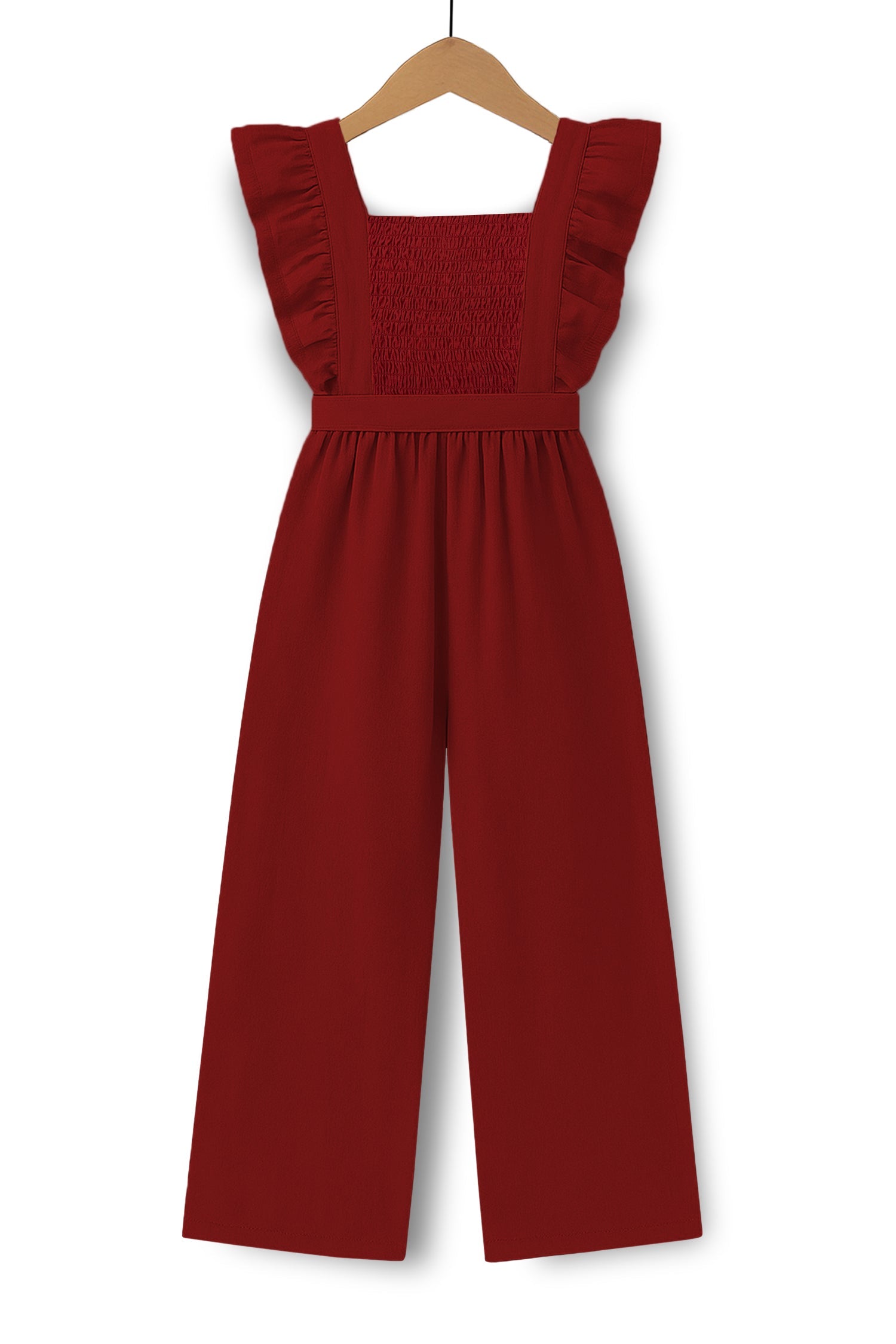 Trampoline Girls Maroon Cotton Slub Ruffle Sleeve Jumpsuit with Belt & Square Neck