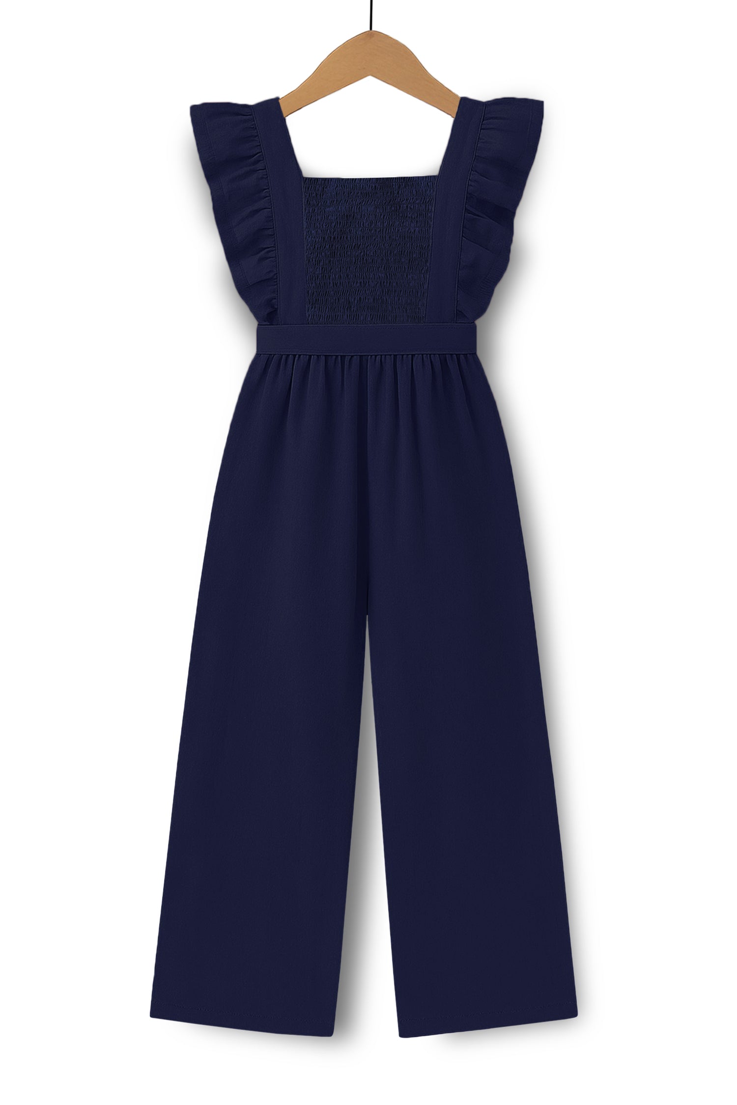 Trampoline Girls Navy Blue Cotton Slub Ruffle Sleeve Jumpsuit with Belt & Square Neck