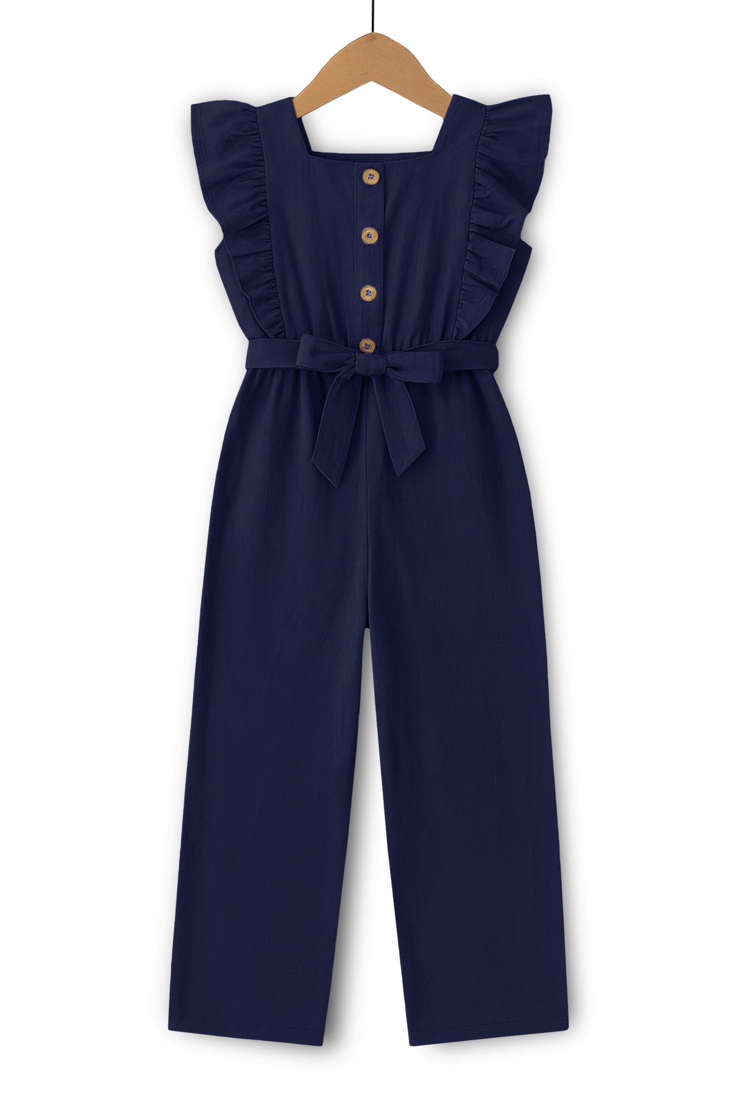 Effortlessly stylish and comfortable, this navy blue girls jumpsuit is crafted from soft cotton slub fabric for a breathable and natural texture. Designed with a square neckline and adorable ruffle sleeves, it perfectly blends charm with comfort. The button-down front and self-fabric belt add a touch of elegance, making it ideal for day outings, festive gatherings, or casual events. Pair it with cute sandals or ballerinas for a complete chic look.
