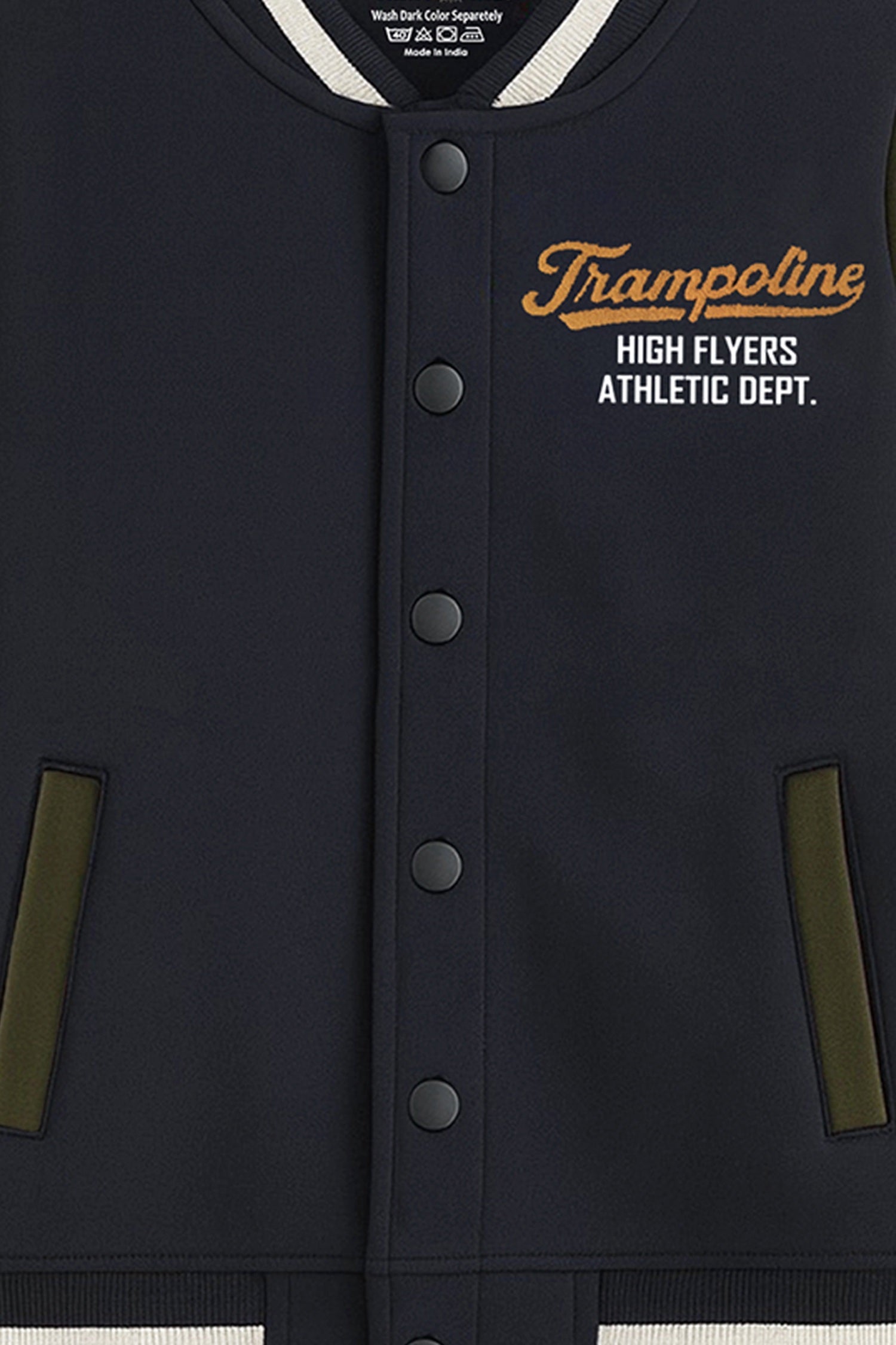 Give your child a cool and sporty look with this stylish kids varsity jacket, designed with a green suede body and contrasting black fleece sleeves for extra comfort and warmth. The colorblock pattern with striped ribbed hem, cuffs, and collar adds a trendy athletic vibe. Featuring a towel-printed “Trampoline” logo on the chest, this jacket is perfect for casual outings, school, or layering in colder weather. With its soft fabric blend and front snap-button closure, it combines durability, comfort, and fashion in one must-have piece.